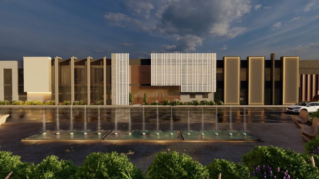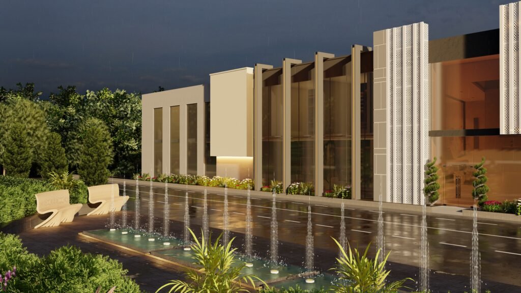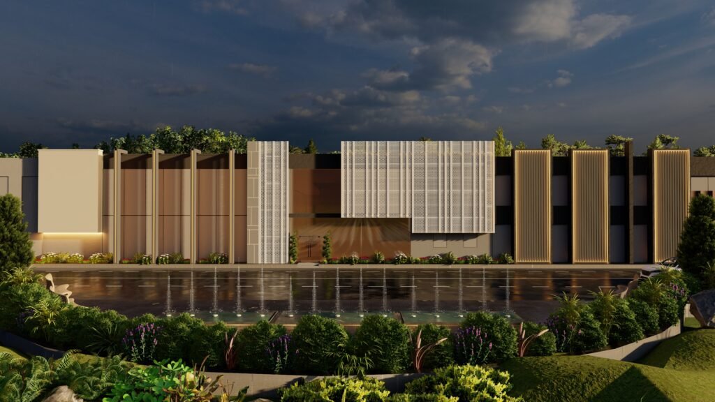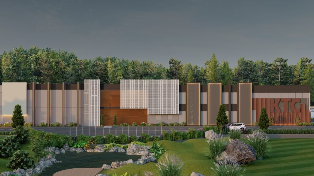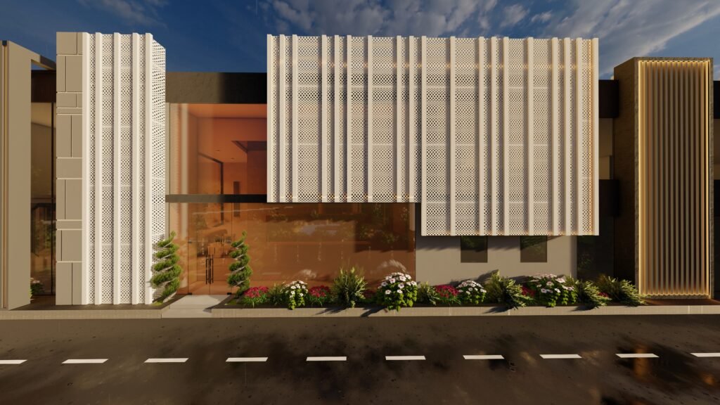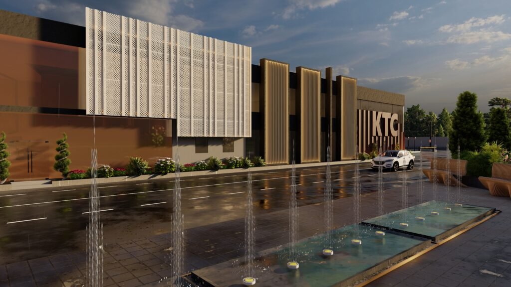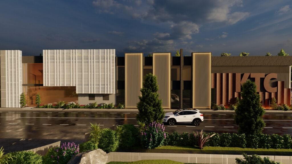 The KTC – project combines modern design elements with industrial architectural raw expressions by uniting smooth structures with strong construction components. The building exterior combine’s mercury glass and MS frames paired with MS perforated sheets to which plaster corrugated sheets and paint are added to form a visual masterpiece. An organized selection of gray shades with light and dark tones produces industrial aesthetics through their contrast with white and rusty iron tones that achieve a contemporary look. White perforated sheet façades allow sunlight to enter the building space but also protect privacy through those openings creating practical and visual advantages. Different types of lights including profile lights, rope lights, garden lights, and wall lights produce dramatic shadow effects which make the structure more prominent as a whole. The KTC project successfully displays industrial power combined with contemporary design sensibilities from its Mardan location in the market.