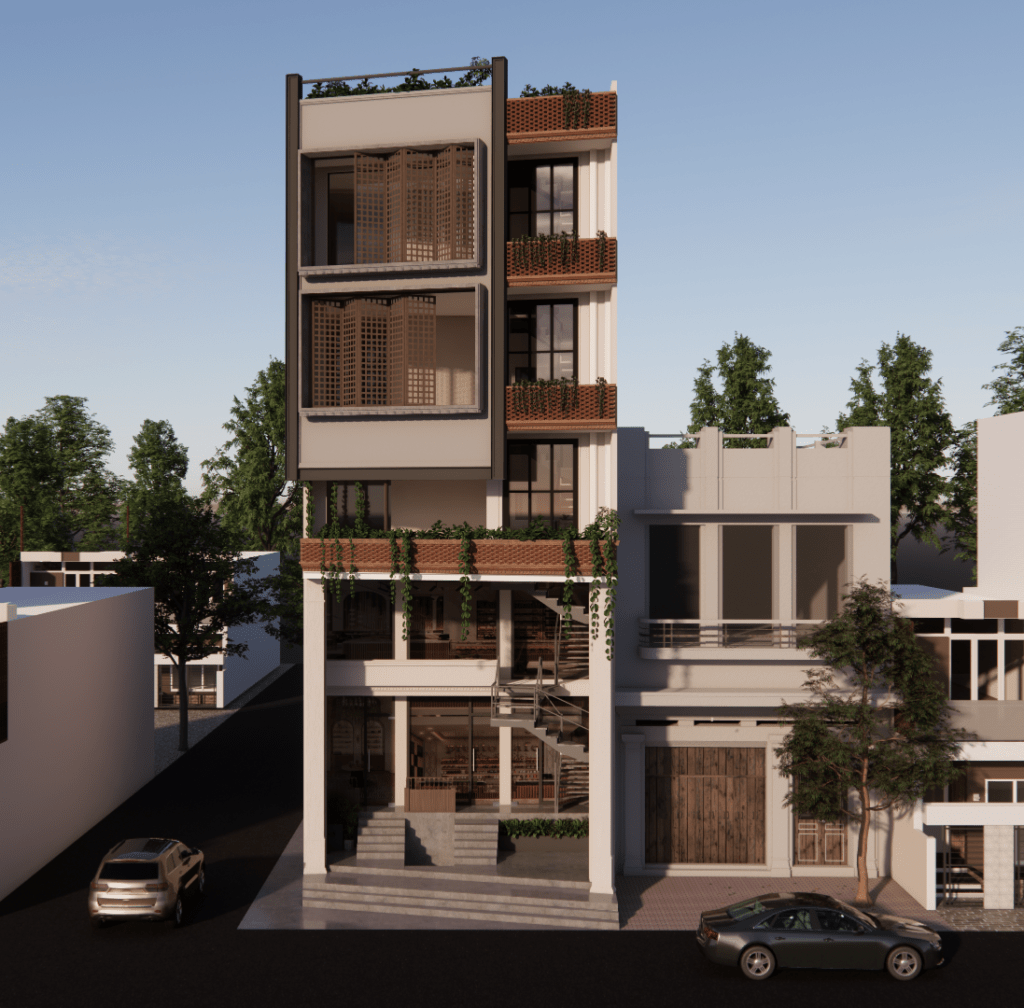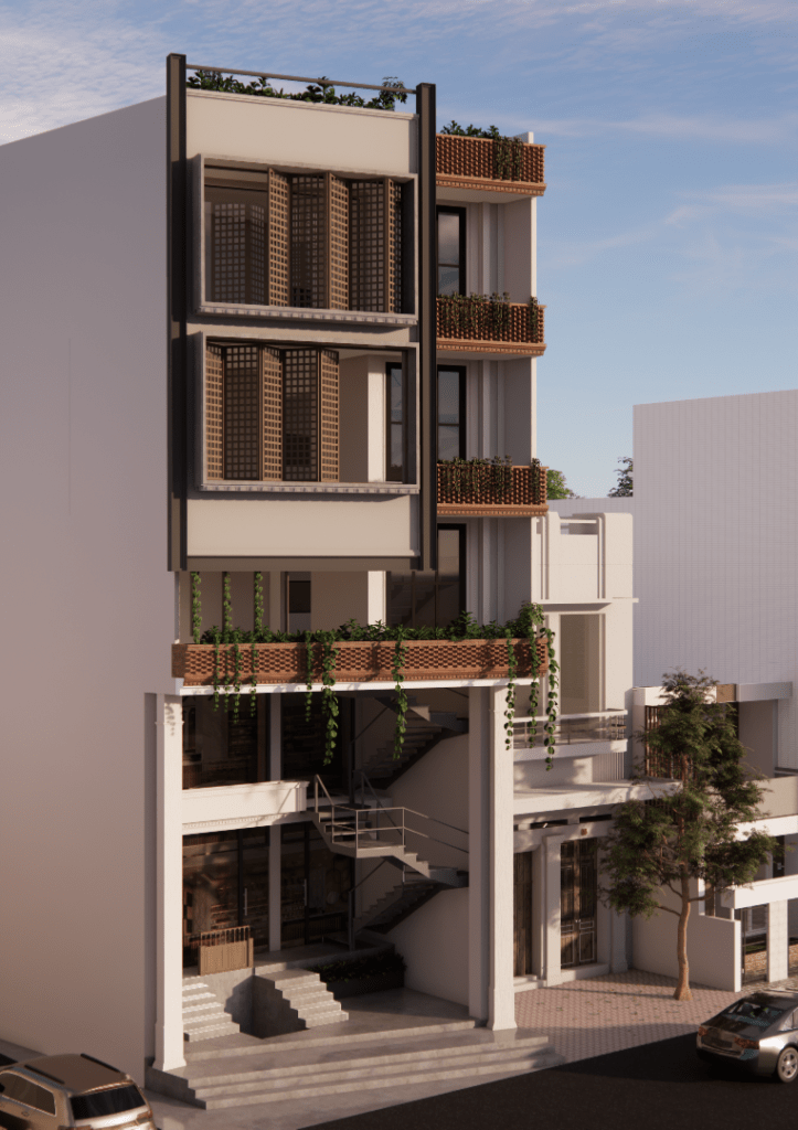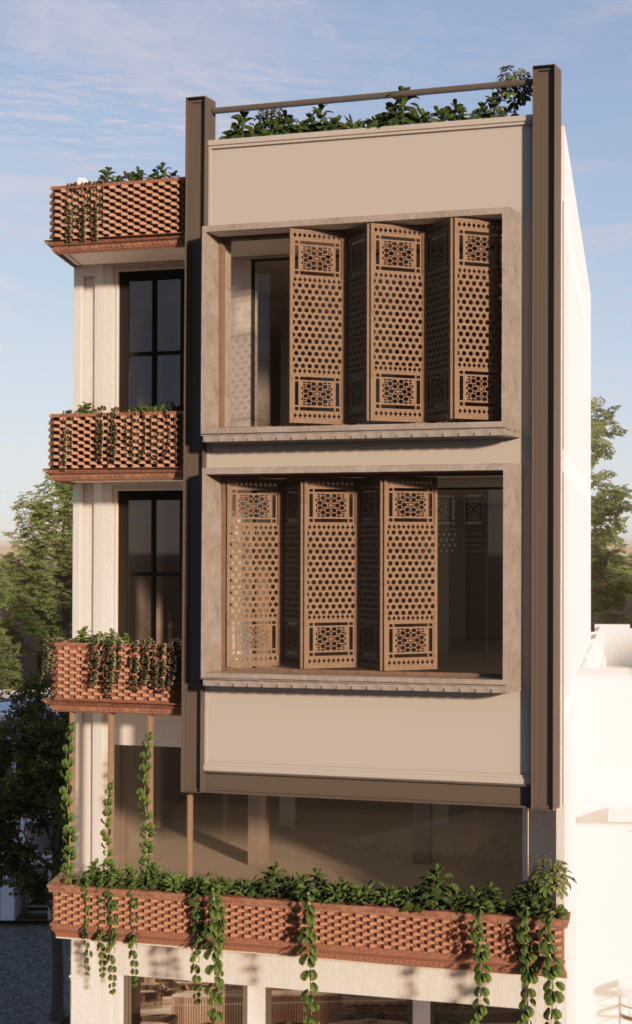 The exterior of this Gawal Mandi building showcases a mixture of contemporary and traditional architectural elements. The facade features earthy-toned terracotta lattice panels that enhance ventilation and aesthetics while maintaining privacy. Greenery cascades from the balconies add a fresh touch to the modern structure. The ground floor has an inviting entrance with arched wooden doors and large glass windows. The upper floors include expansive windows and shaded balconies, providing sufficient natural light and airflow. The rooftop terrace is designed as a cool retreat, which is yet to complement the entire urban urban-inspired design. The combination of modern geometry and traditional materials gives this structure a unique, visually striking appearance in a busy cityscape.