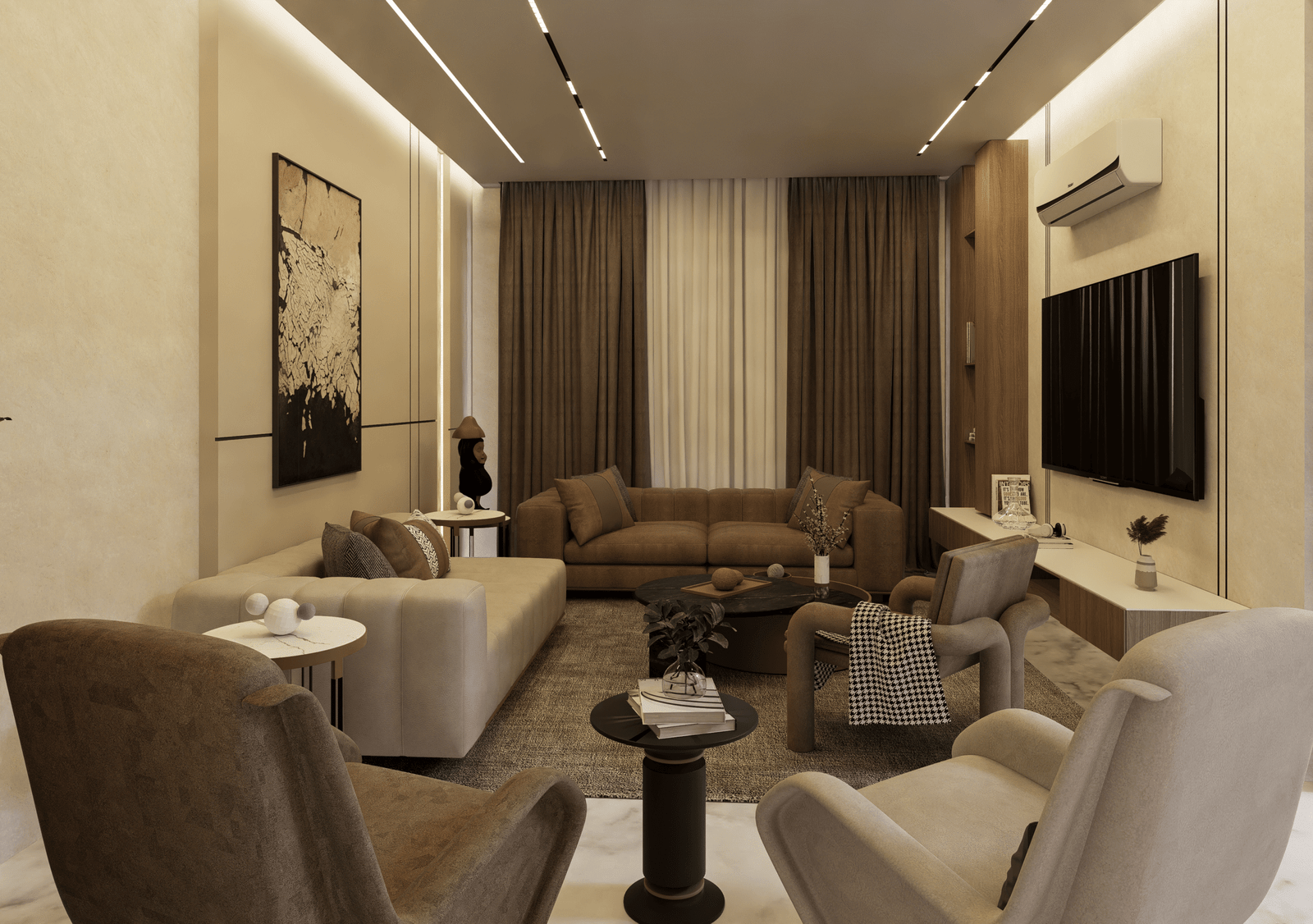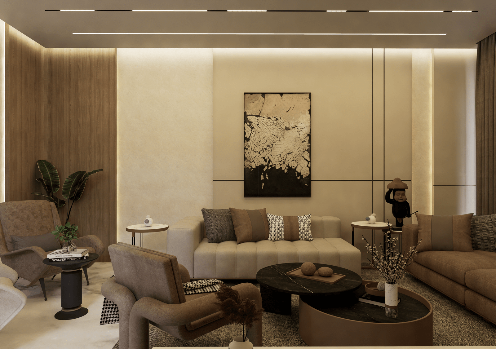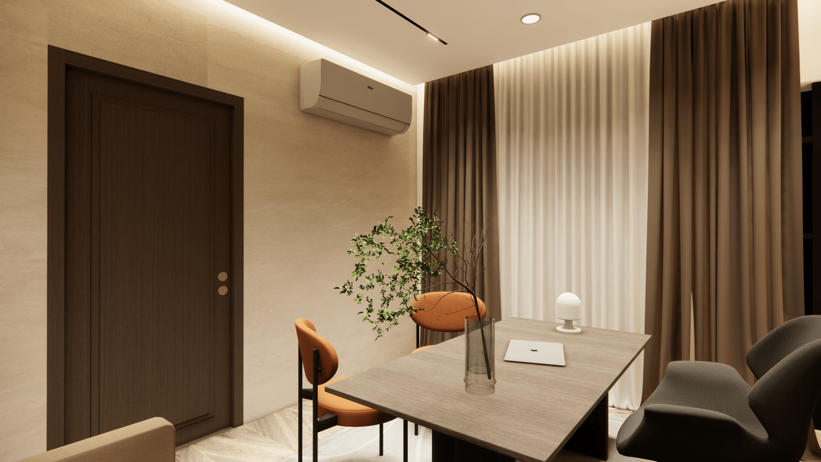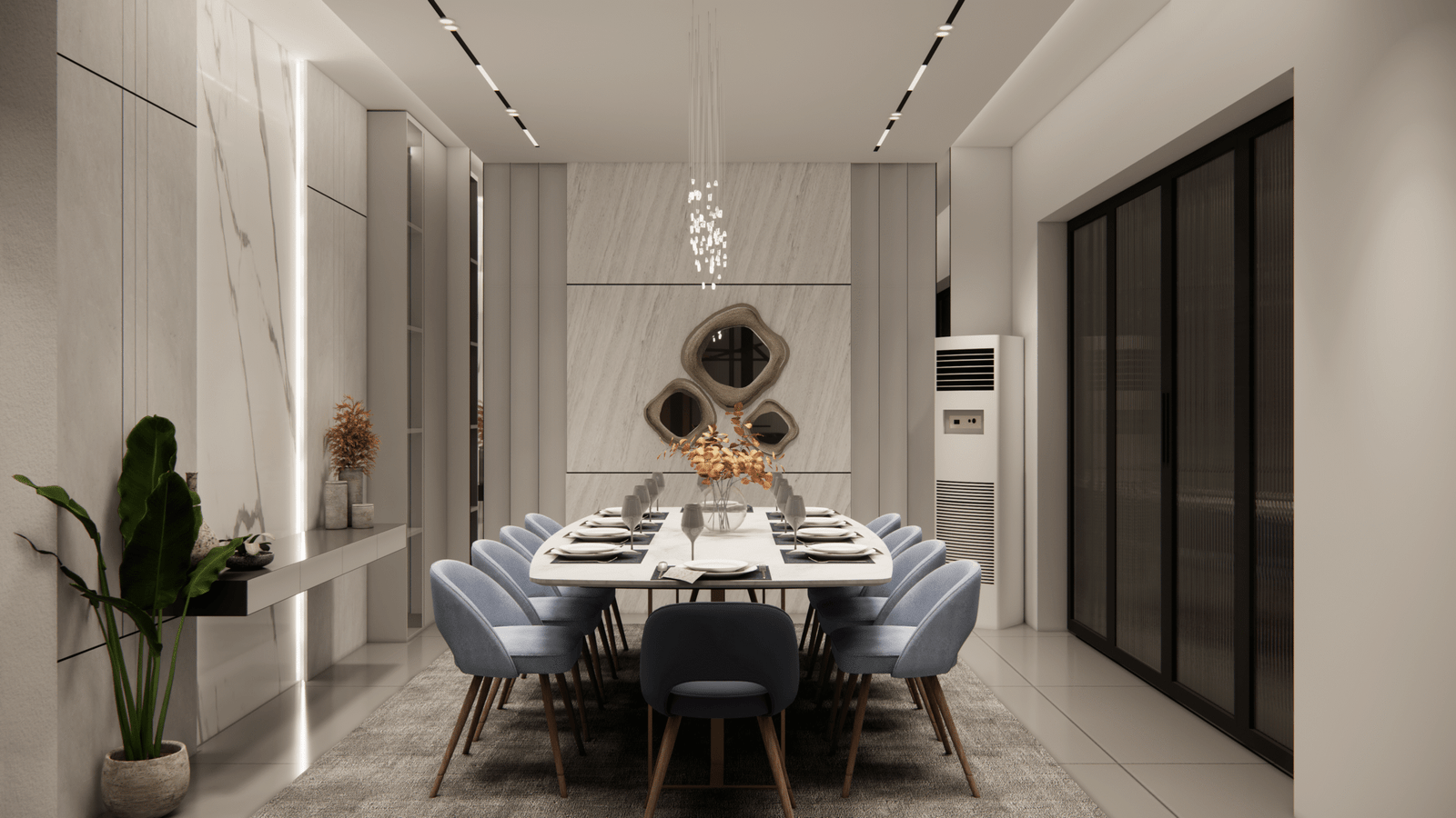 The dining room has a large proportionately balanced table against a feature wall of book-matched marble, where the veining forms a focal point to an otherwise minimal scene. The wall has vertical niche storage, and the interposition of lights into the wall provides light and depth. The room is planned on a symmetrical pattern, and the upholstered dining chairs of muted blue give it a soothing contrast to the neutral envelope of the room. Geometrical ceiling lighting emphasizes the geometry of the chamber, and a hanging sculptural lamp was used to balance it out with the organic nature. There is a visual stratification accomplished through the use of material finishes, in the smooth rock floor and the textured area rug, which leads the eye in an intuitive way to the center of the room.