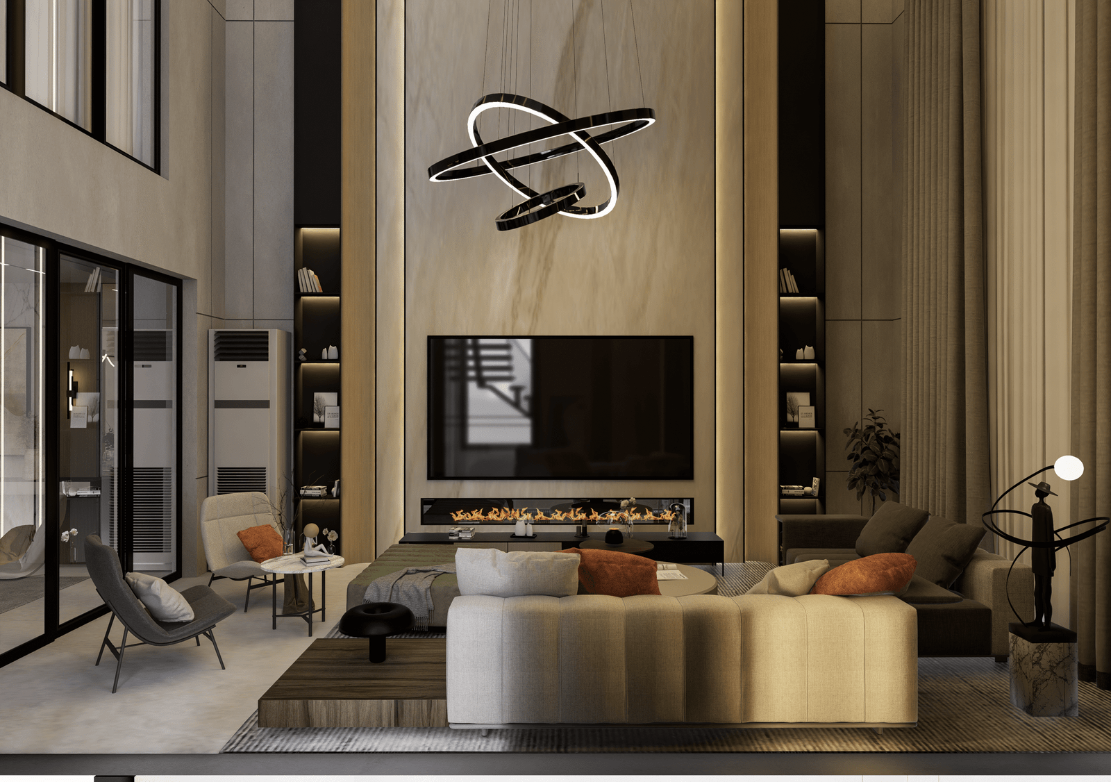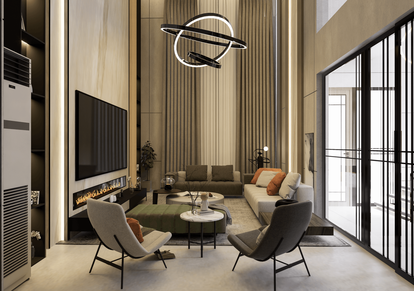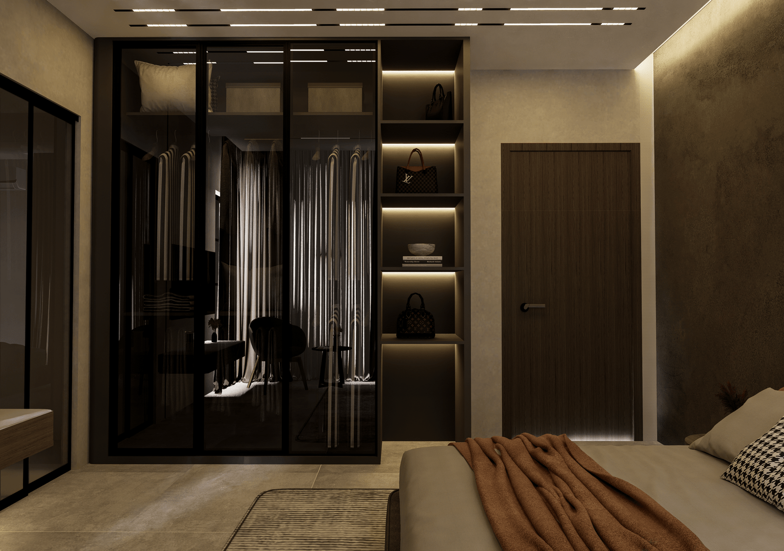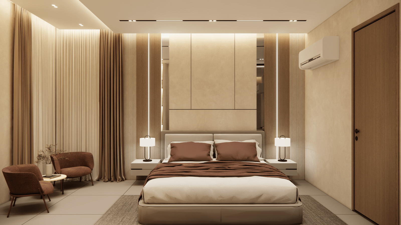 The dining room has a large proportionately balanced table against a feature wall of book-matched marble, where the veining forms a focal point to an otherwise minimal scene. The wall has vertical niche storage, and the interposition of lights into the wall provides light and depth. The room is planned on a symmetrical pattern, and the upholstered dining chairs of muted blue give it a soothing contrast to the neutral envelope of the room. Geometrical ceiling lighting emphasizes the geometry of the chamber, and a hanging sculptural lamp was used to balance it out with the organic nature. There is a visual stratification accomplished through the use of material finishes, in the smooth rock floor and the textured area rug, which leads the eye in an intuitive way to the center of the room.